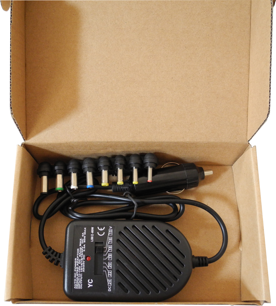 Carica notebook universale da auto, compatibile con la maggior parte dei modelli in commercio. Controllare la tensione presente sull'alimentatore o sul notebook stesso e impostarla tramite l'apposito interruttore.